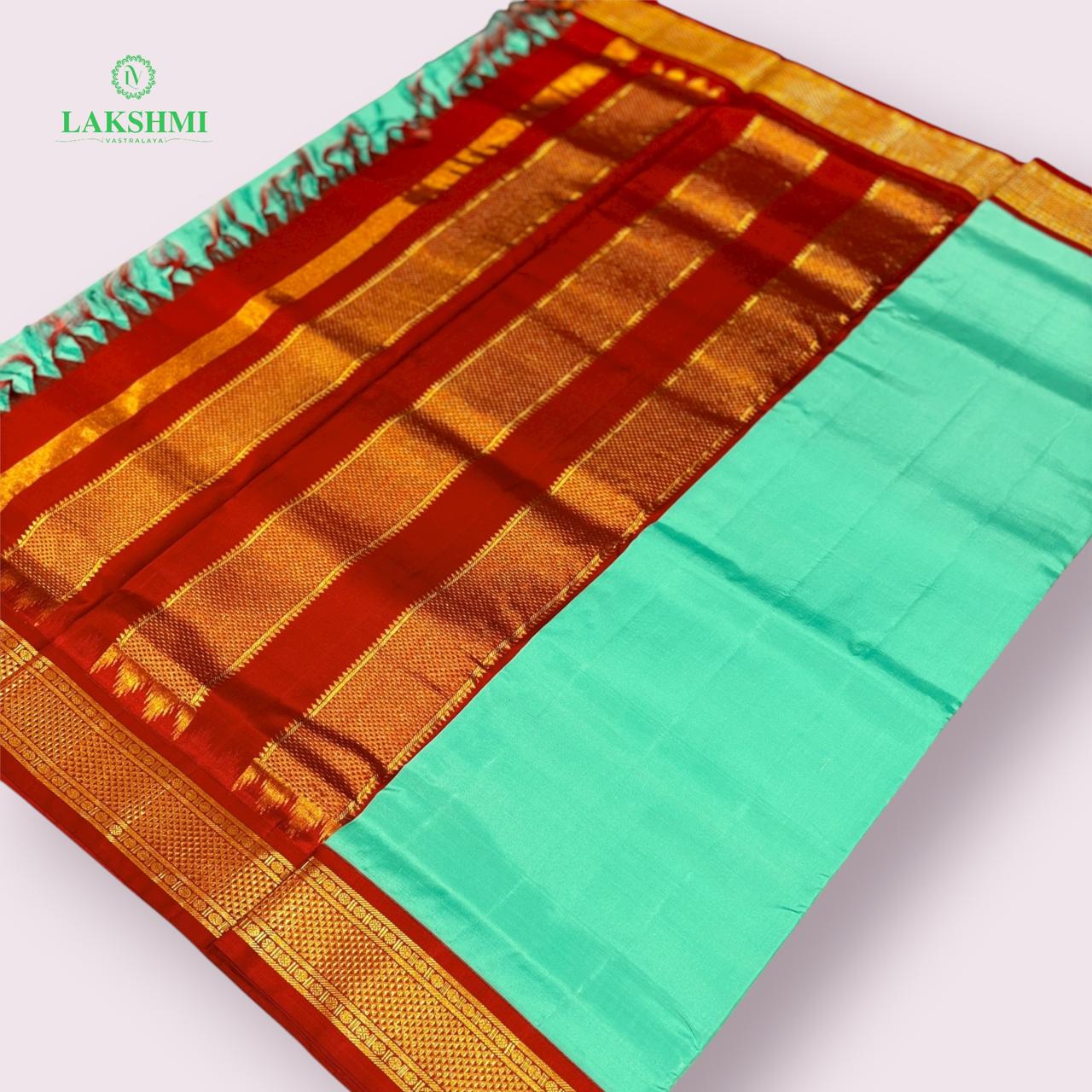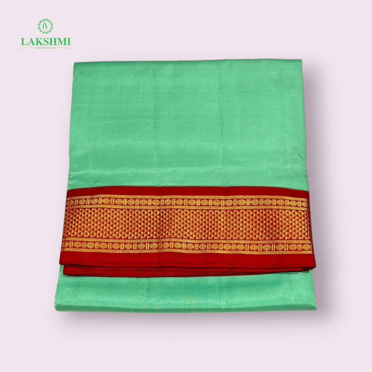 This vibrant Teal Green Madisar in pure Kanchipuram mulberry silk (≈10.5 yards) is paired with a Red border, symbolizing auspiciousness and tradition. Its radiant color combination and lustrous texture make it an ideal choice for weddings, rituals, and festive wear.